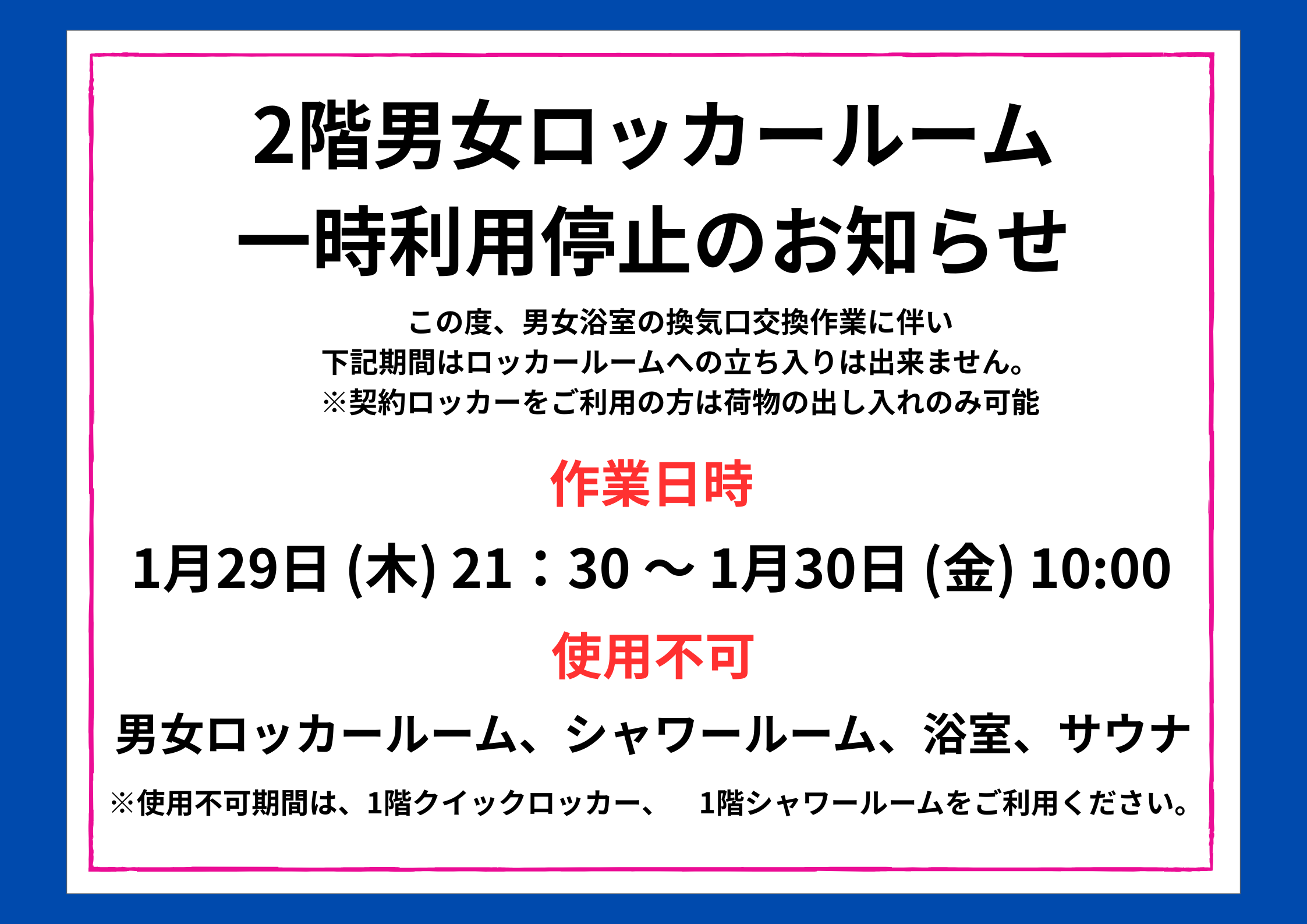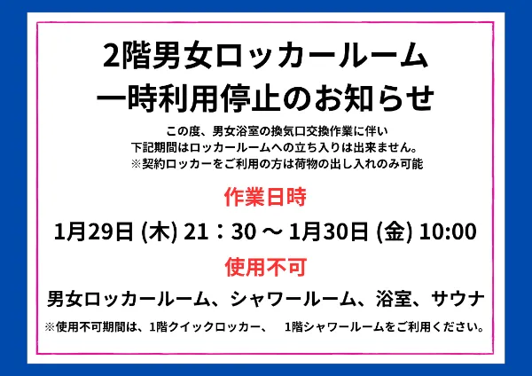 2階ロッカールームの一時利用停止をお知らせいたします。